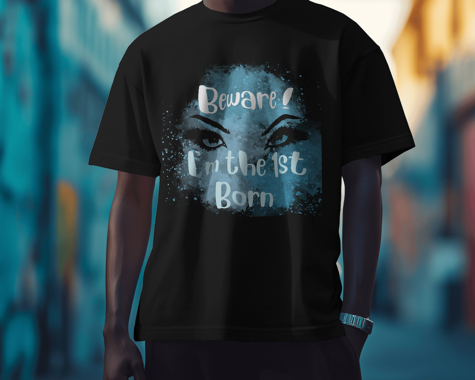 The graphic features a pair of intense, mesmerizing eyes emerging from a misty void, crowned with the warning “Beware! I’m the 1st Born.” This is a visual manifestation of pure, unfiltered confidence—the kind that comes from knowing you set the standard. It’s a compelling, slightly defiant way to communicate that your point of view is the origin point, the Genesis of the truth.
